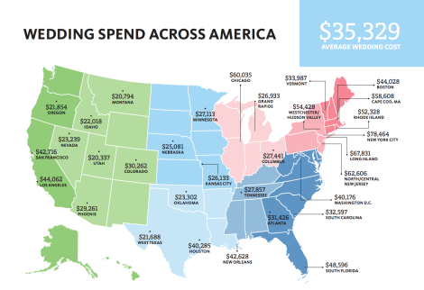 That's up from $32,641 in 2015! according to the 10th annual The Knot survey. The Knot Real Weddings Survey, hit the wire today and the results are interesting to say the least. The average cost of a wedding is at an all-time high at $35,329 and spend is up across most categories throughout the U.S. Our survey is the largest study of its kind. This year more than 13,000 couples who had planned a wedding and got married in 2016 completed the survey. Our in-house research and insights team compiled the data to give you the national average as well as the average cost of weddings across the country (because obviously a wedding in Manhattan costs more than a wedding in Omaha!).